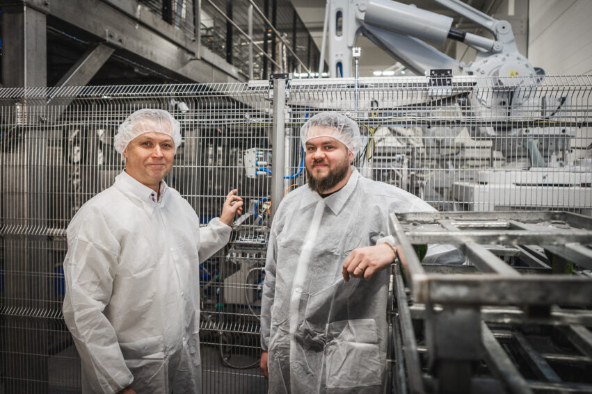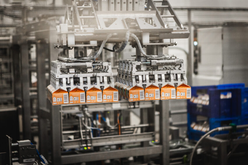 Finn-Metaconin valmistamat ja LSK Technologyn automatisoimat kuljettimet ja pakkausrobotit tehostavat Satamaidon tuotteiden jälkipakkausta.